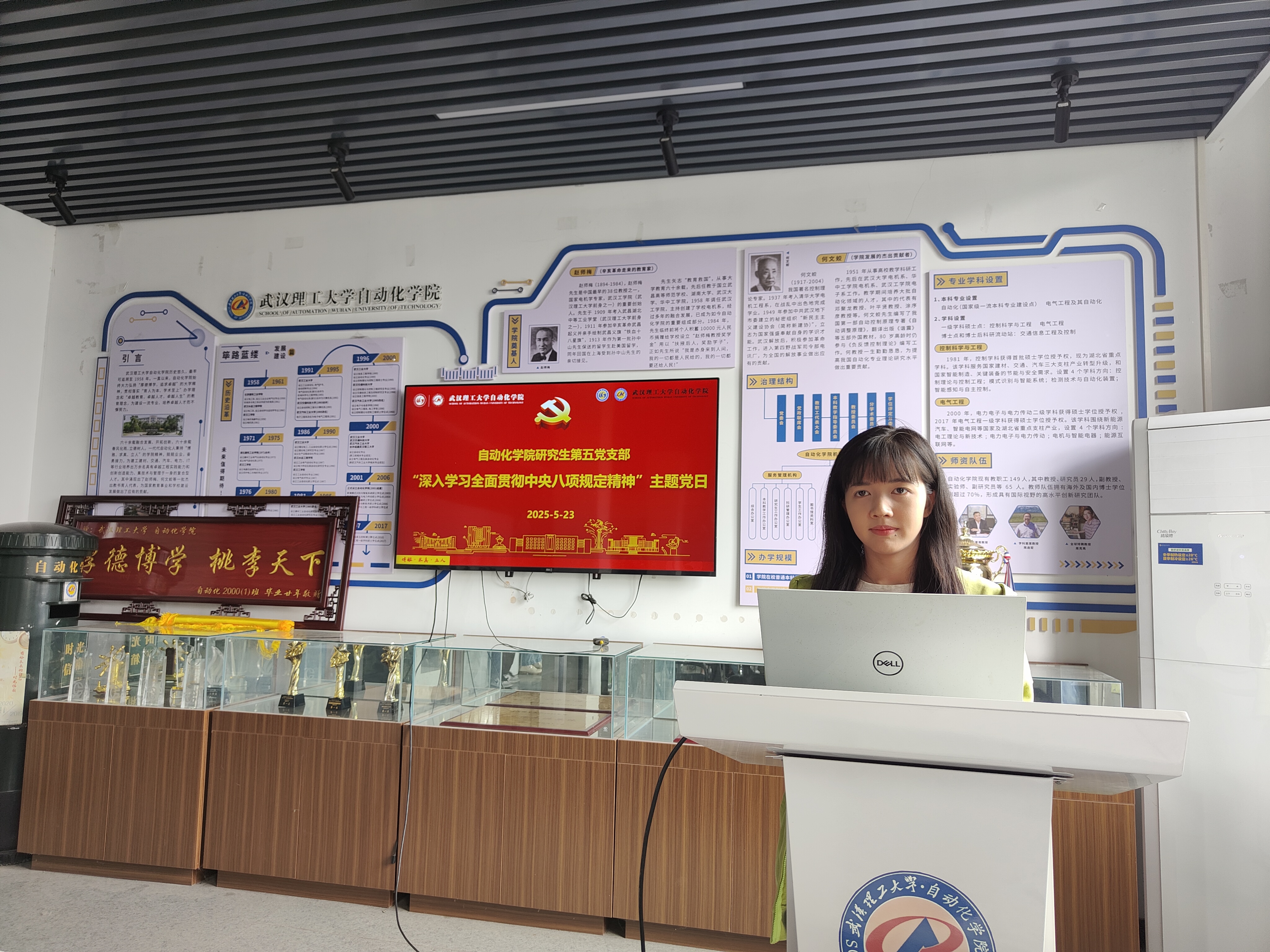 2025年5月23日中午,beat365官方网站研究生第五党支部在综合楼三楼文化展厅组织开展“深入学习贯彻中央八项规定精神”主题党日活动。书记尚宇菲同志主持会议,支部党员通过线上线下结合的方式积极参与。